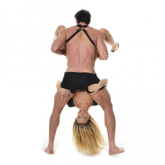 Фиксация крепится на мужчине как сбруя, и женщина удерживается на весу при помощи петель для ног и специальных креплений на шее мужчины